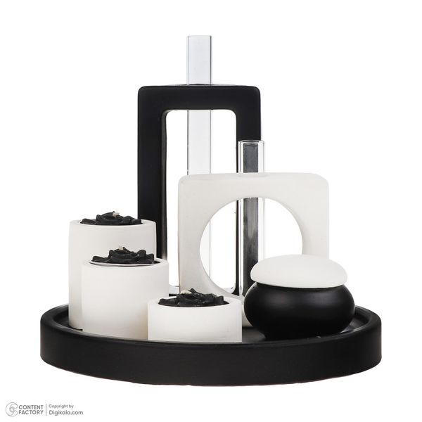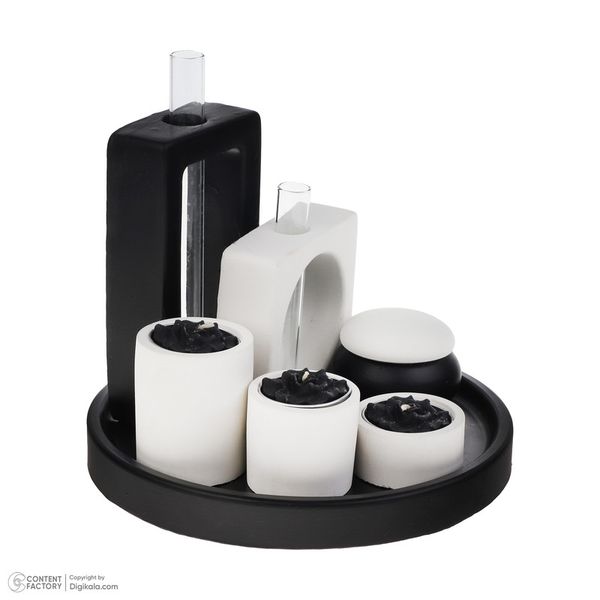 محصول شامل سه عدد جاشمعی به همراه شمع ، دو عدد گلدان ، یک عدد جاعودی و یک سینی میباشد که همگی با یک بسته بندی ارسال می شود.